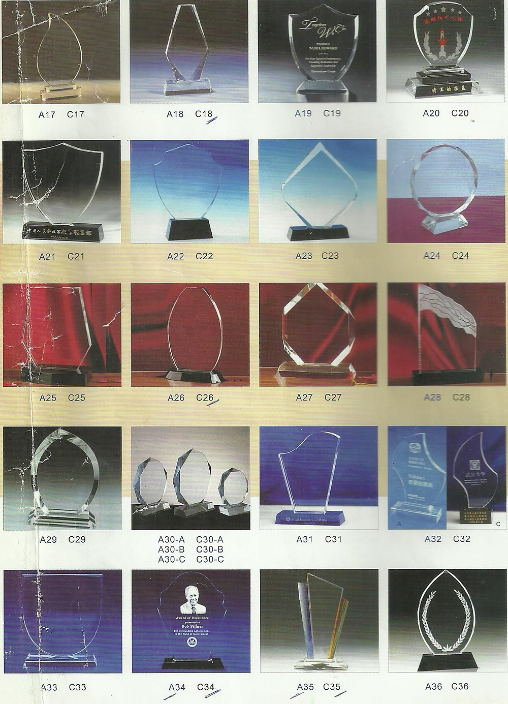 Here you will find available shapes and types for our award plaques and trophies. When you see C it means Crystal, the one starting with A stands for Acrylic and W=Wood. Make your choice by picking the number and letting us know which number. Choose more than one option please in case your chosen option finished from our stock.